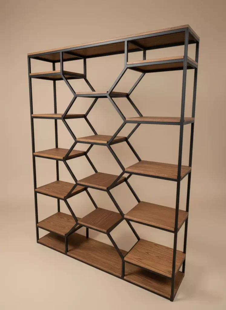 Оригинальный открытый стеллаж с симметричным расположением шестигранных ячеек в форме сот. Геометрическая композиция из металла и дерева становится ярким арт-объектом и функциональным элементом интерьера. Ячейки-соты разного размера подходят для размещения книг, декора, растений, коллекций. Необычная форма привлекает внимание и создает интересный визуальный эффект. Изготавливается индивидуально с возможностью корректировки размеров всего стеллажа, количества и размера ячеек, выбора цвета.